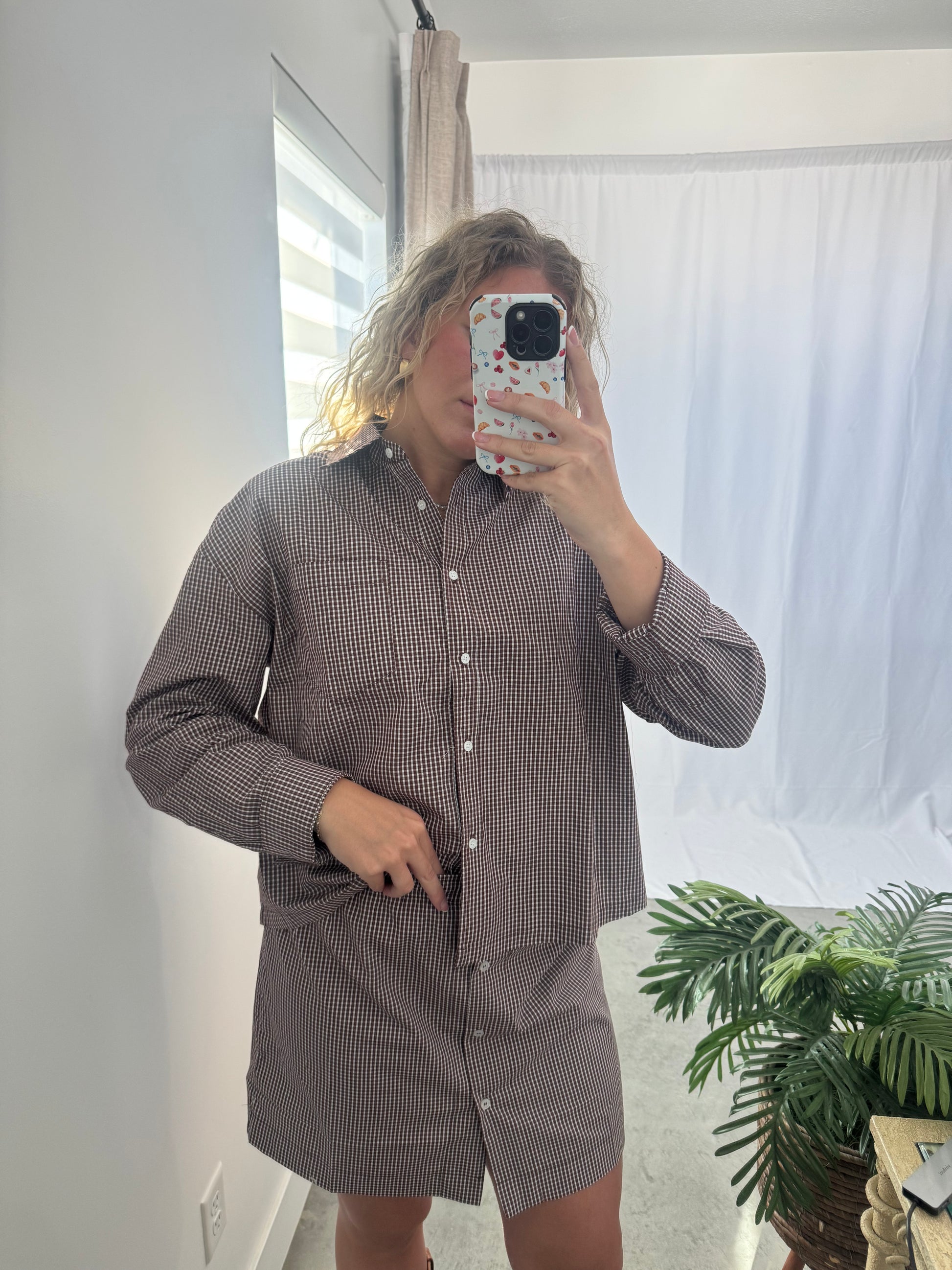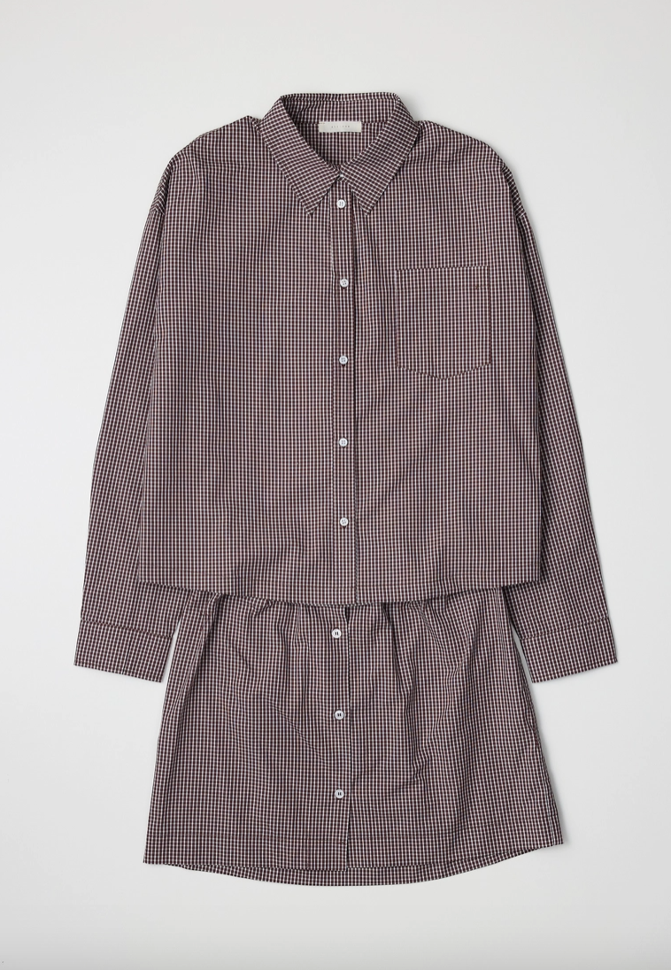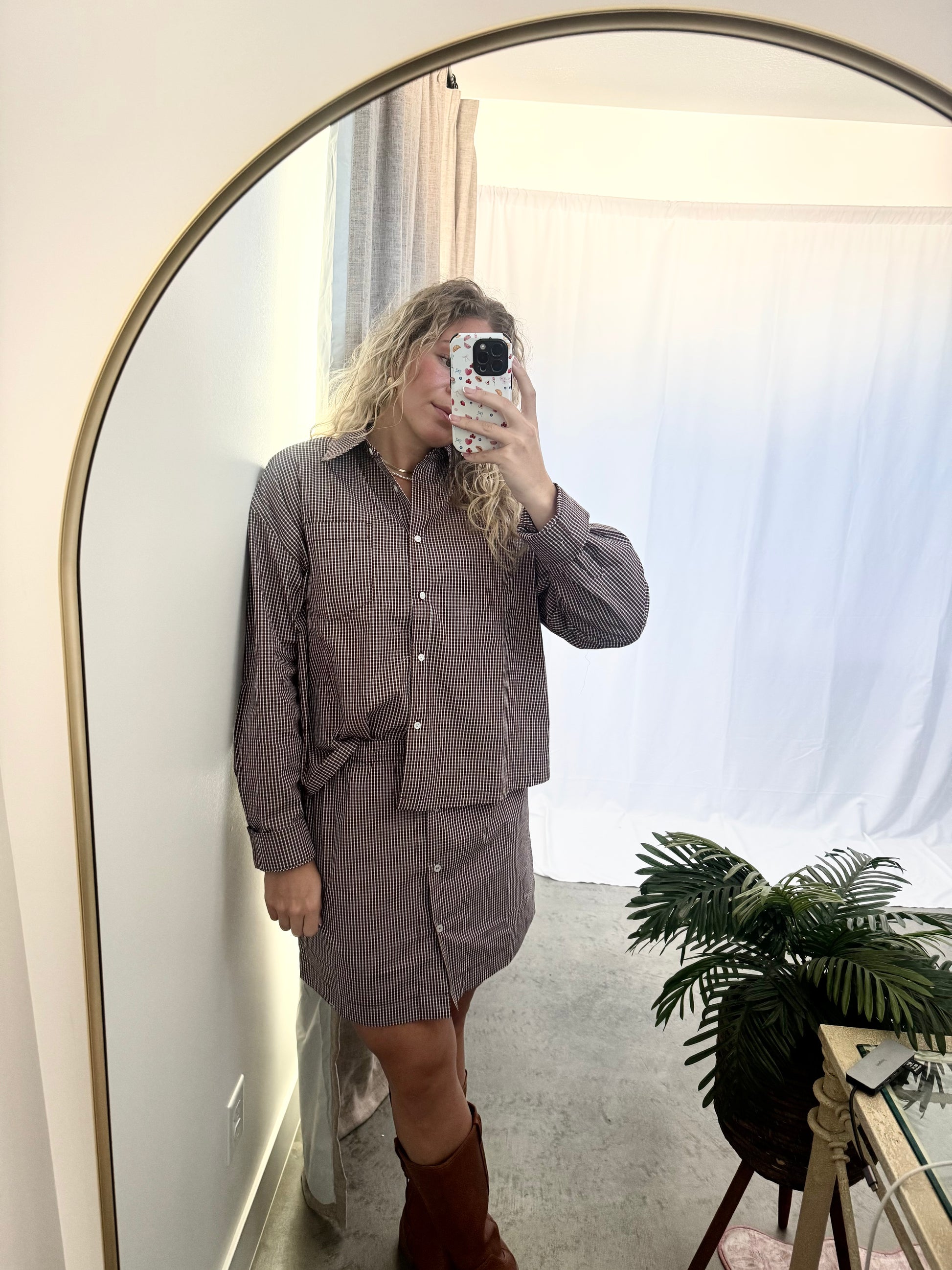 Say hello to effortless style. The Weekend Set features a brown gingham collared top with a matching skirt that brings comfort and charm together in the cutest way. The crisp collar adds a touch of structure, while the soft gingham pattern keeps things timeless and easy to wear.